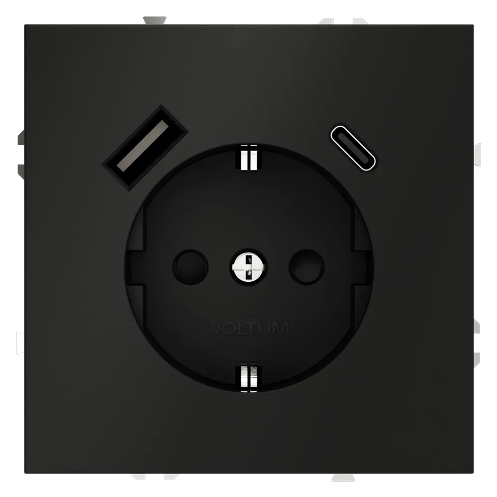 Розетка встраиваемая VOLTUM S70 с заземлением и защитными шторками 16А с USB А+С (черный матовый)